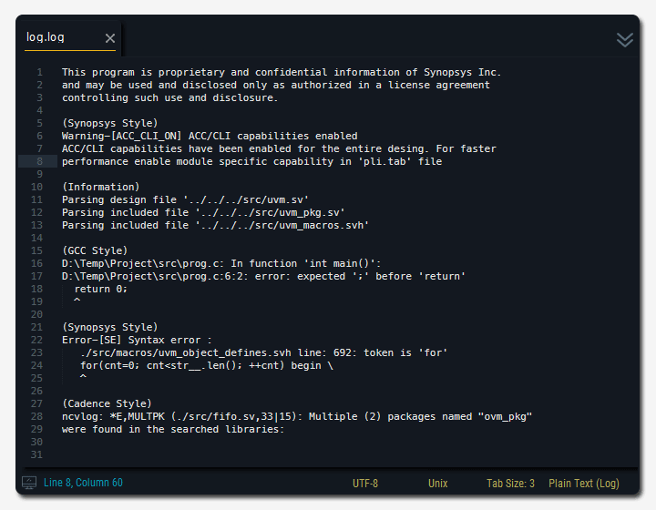 { /* Configuration ____________________________________________ */ // enable context menu "context_menu": true, // Auto Highlight for a log file, build window "auto_highlight" : true, // Output panel list for Auto Highlight "auto_highlight_output_panel": ["exec"], // exec = build /* log list _________________________________________________ */ "log_list" : { "example" : // specify name as yours { "type" : "compile", // "compile" - link, bookmark (icon) are usable, "system" - only for highlight "extension" : [ "*.log", ".vcs.log", ".cpp.log", "message*" ], "output.panel" : [ "exec" ], // exec - to apply to build results "use_link" : true, "search_base": { "enable" : true, // false : when using absolute path "ignore_dir" : [""], // hidden folders are ignored as default, like .git, .svn "max_scan_path" : 1000, }, "bookmark" : { "enable" : true, // false : do not display icons too "goto_error" : true, // automatically goto 1st error line }, "severity" : { "error" : { // specify name as yours "enable" : true, "pattern" : [ // [ "begin regex", "end regex" ] or [ "match regex", "" ] // examples [ "^Error-\\[", "^\\s*[\\n]" ], // Error-[ ~ next empty line (multi-line) [ "^{{{LINK}}}?[^\\r\\n]*?(?i)error", "[\\r\\n]" ], // a line including case-insensitive 'error' with or without a link in front of 'error' [ "^\\w+:\\s*\\*E", "[\\r\\n]" ] // ...: *E ... (single line) // <-- remove, change, add more patterns here --> ], "color" : { // ["foreground", "background"] "base" : ["#F92672", ""], // error message "link" : ["#E6DB74", ""], // link in error message "quote" : ["#4F99D3", ""], // quote in error message }, "icon" : "Danish Royalty/error.png", // remove "icon" not to use icon, "dot", "circle" "bookmark" are possible }, "warning" : { // specify name as yours "enable" : true, "pattern" : [ // examples [ "^Warning-\\[", "^\\s*[\\n]" ], [ "^{{{LINK}}}?[^\\r\\n]*?(?i)warning", "[\\r\\n]" ], [ "^\\w+:\\s*\\*W", "[\\r\\n]" ] ], "color" : { "base" : ["#A1B347", ""], "link" : ["#FD971F", ""], "quote" : ["#4F99D3", ""], }, "icon" : "Danish Royalty/warning.png", }, }, "theme": { "foreground" : "#D7D7D7", "caret" : "#F29718", "selection" : "#3A5166", "selectionBorder" : "#181E26", "lineHighlight" : "#283240", } }, // <-- remove, change, add more log list here --> }, }Log List 에는 example 이란 이름으로 log 의 종류를 구분하는 setting 이 들어가 있으며 User 가 추가해서 다른 종류의 log 를 정의할 수 있다. 각 종류는 extension 을 정의해서 구분할 수 있다. severity 에는 Error / Warning 이 들어가 있는데, User 가 별도로 정의해서 쓸 수 있다. Pattern 은 Regular Expression 을 사용해서 정의한다. Color / Icon 도 바꿔서 쓸 수 있다. User Settting 을 Customize 했다면, Ctrl+shift+p > Log Highlight: Generate Syntax & Theme 을 실행하여야 한다.